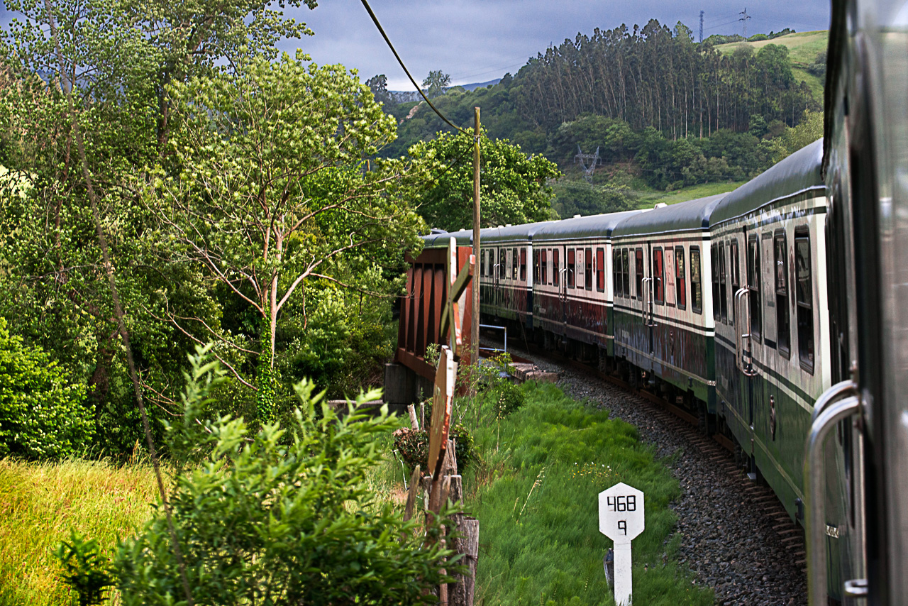 San Sebastián es el punto de encuentro para el medio centenar de viajeros del Transcantábrico. El autobús de apoyo traslada la expedición hasta el tren que aguarda en Bilbao, donde la tripulación ofrece una copa de bienvenida. El silbato anuncia la salida y el tren se pone en marcha. Que nadie espere un tren silencioso, rápido y sin movimientos, porque precisamente lo que aquí se ofrece es todo lo contrario. Se trata de vivir experiencias, y tan preciado es el “dónde”, como el “cómo”. No se sobrepasan los 45 km/hora y el traqueteo de las ruedas surcando las vías se hace palpable desde el minuto cero, tanto por el vaivén como por la machacona melodía del cha-chá-chá que nos acompaña. Por suerte las noches son sosegadas, ya que el tren permanece estacionado, lo cual todo el mundo agradece. A las ocho de la mañana el hombre de la campanilla, tal como era costumbre en los viajes de la edad de oro del tren, despierta a los viajeros. La tripulación