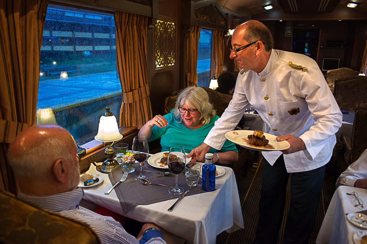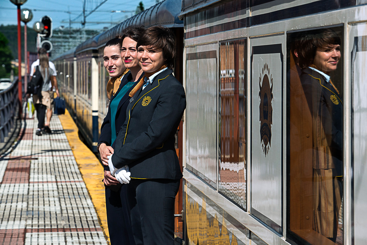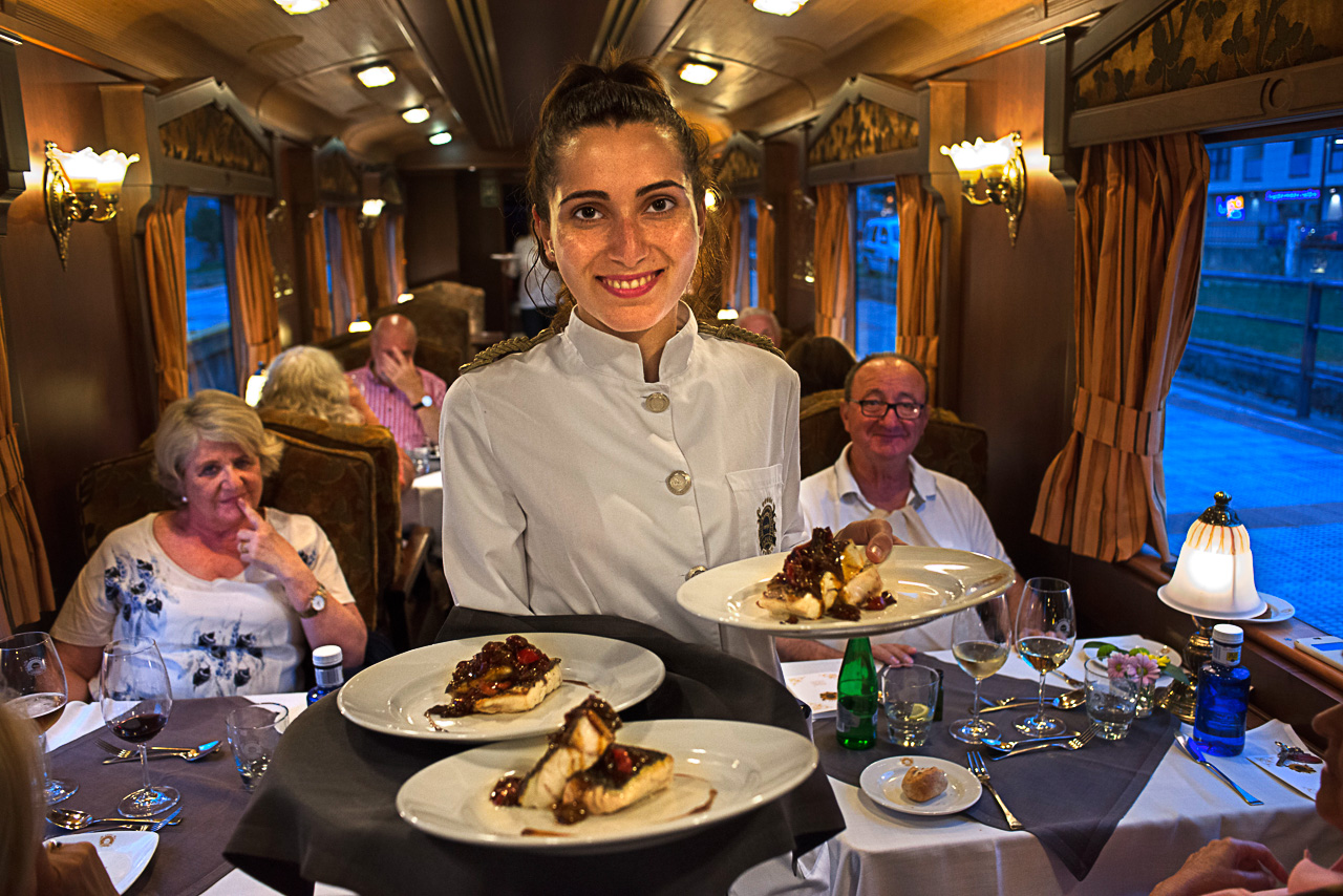 Por delante, 8 días zigzagueando por la cornisa cantábrica a bordo de uno de los trenes más lujosos de Europa que no circula por una línea convencional, sino por una métrica –de un metro de ancho–. Antaño transitaban por ella los trenes del Hullero, una línea férrea creada a principios del siglo pasado por un grupo de empresas vascas del sector metalúrgico que, como energía vital de funcionamiento, necesitaban del carbón que se producía en León. Las vagonetas de carbón ya hace muchos años que no circulan; ahora recorre las vías la joya del patrimonio histórico ferroviario: los legendarios coches Pullman construidos en 1923. Quince vagones rediseñados para la ocasión –7 coches cama y 2 suites de lujo–; otros vagones incluyen el coche salón –con auténticos sofás Luis XVI–, el bar, atendido por un bartender, el restaurante y el vagón-discoteca, cada noche con diferentes propuestas, desde violonchelistas a cantautores.