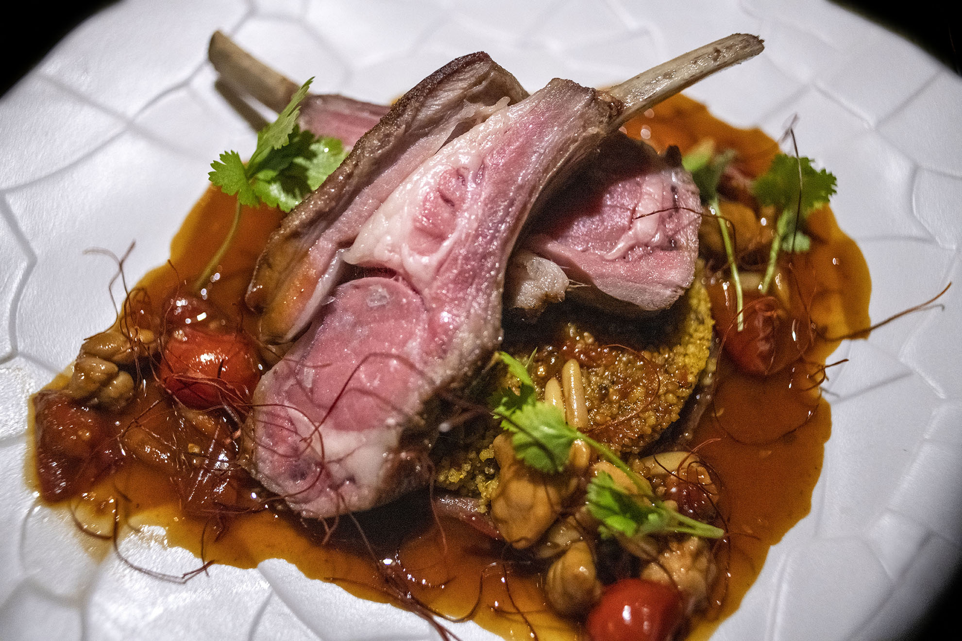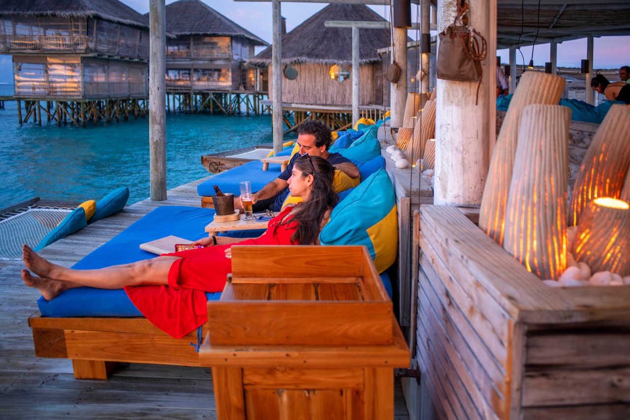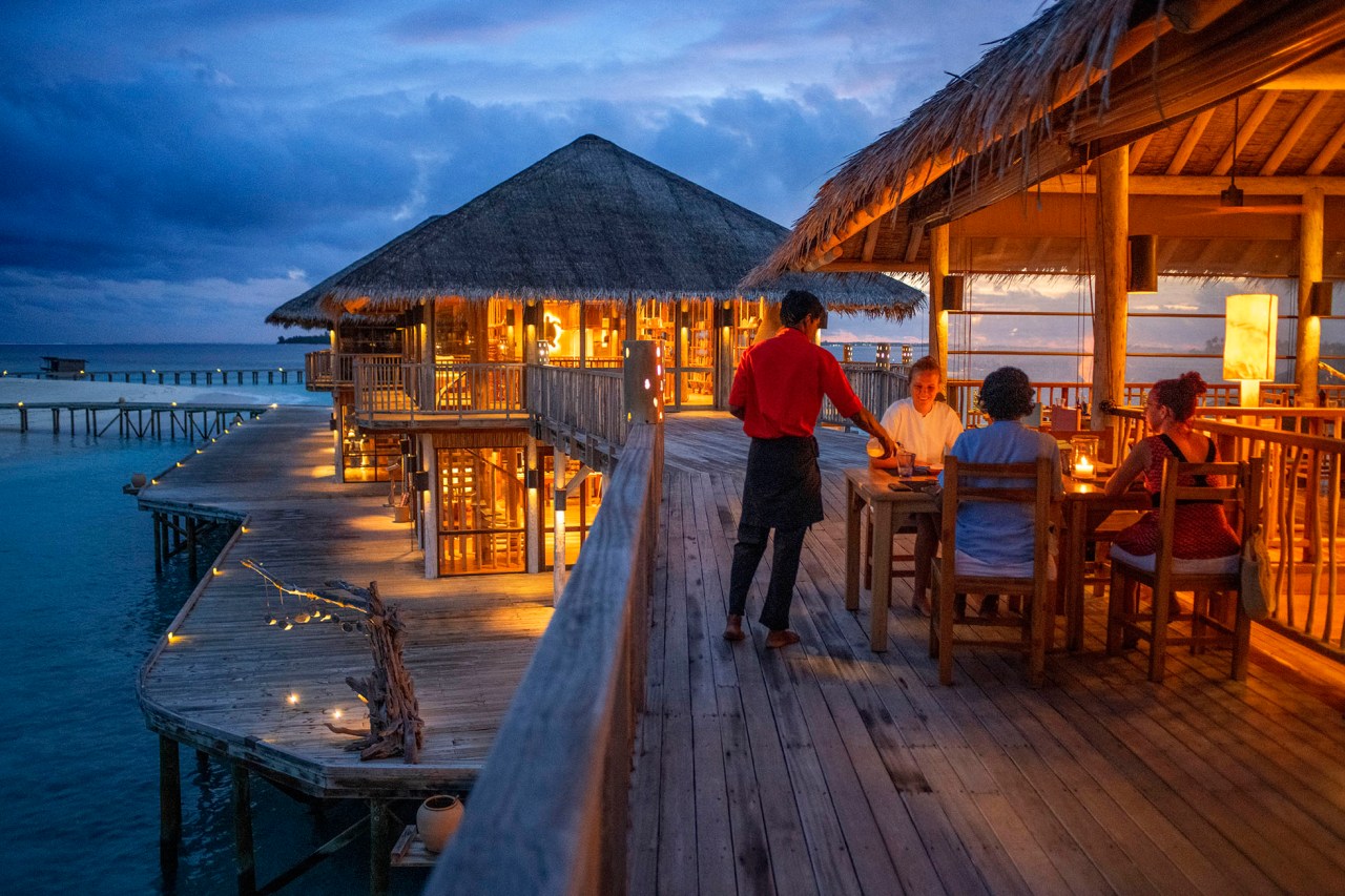 El complejo alberga seis bares y restaurantes que ofrecen exquisita comida orgánica y fresca, la mayor parte de ella elaborada en varios huertos esparcidos por la isla. También cuentan con una planta embotelladora que transforma el agua salada del mar en agua potable, con o sin gas. El compromiso es evitar al máximo posible cualquier uso del plástico. The Longitude ofrece platos internacionales en un ambiente relajado o formal en 2 plantas. Es aquí donde también se imparten las clases de cocina local a los huéspedes interesados en llevarse de vuelta a casa algo más que un mero souvenir. Se preparan platos como la deliciosa ensalada mashuni, que conforma el desayuno habitual de algunos de sus habitantes, elaborada con atún, coco, chiles, limón y cebolla, y acompañada del pan tradicional del país, el roshi, una versión local mezcla del roti indio o del chapati keniata. Anexo al Longitude está el Deck-a-Dence, que ofrece un ambiente muy íntimo con solo 6 mesas directamente sobre el mar. Por las mañanas también es posible desayunar en este lugar, aunque a veces el sol puede resultar excesivamente molesto. En el Zen se pueden probar deliciosas especialidades japonesas. Con reserva previa es posible sentarse frente al cheff en una mesa cuadrada y degustar la comida Teppanyaki, donde el chef exhibe sus dotes en una impresionante combinación de talento y habilidades, elaborando los platos mas saludables y deliciosos de la cultura Japonesa en una especie de show. En el LEAF, se sirven delicias del propio huerto orgánico del complejo y pescado. Una cocina gourmet mediterránea que utiliza íntegramente ingredientes cultivados en sus jardines orgánicos y productos locales. El menú cambia a diario y está inspirado siempre en los ingredientes más frescos. En el Chili bar se pueden probar hasta 14 cócteles tropicales exclusivos, que incluyen bebidas exhoticas como Laamu Beach Party (una mezcla de whisky, ron, arándano, mango y jengibre) y Atoll Punch, un brebaje de frambuesa y vodka que rinde homenaje a las islas locales. Cuenta con grandes y cómodas camas de día con vistas al mar, y decoración rústica, pero elegante, de madera. Las noches se amenizan con un DJ residente, que nada tiene que envidiar a las noches ibicencas. En el Ice & Chocolate Studio se pueden degustar más de 40 tipos de helados gratuitamente y además comprar chocolates y bombones elaborados