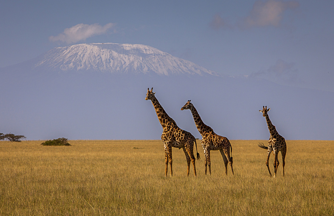 Safari, es una palabra suajili que significa viaje. Hay muy pocos lugares en la tierra que doten de sentido a un viaje, como el territorio keniata y su gente. Nuestro safari lo iniciaremos en el deslumbrante Parque Nacional de Chyullu Hills, en el sudoeste del país. Marcado por las colinas de Chyulu, de origen volcánico, que le dan nombre y cuyos picos van de los 1500 a los 2160 metros. Y con el Kilimanjaro como telón de fondo en su cara sur. Esta mítica montaña, formada por tres volcanes, es la estampa más conocida del parque, aunque se alza sobre tierras de Tanzania. El paso de jirafas y elefantes enmarcados por la montaña que tiene el pico más alto de África, el Uhuru de 5891 m, es todo un espectáculo. Su cubierta permanente de nieve hay que admirarla con mucho detenimiento, pues seguramente no la volveremos a ver otra vez con similar cantidad de hielo; desde principios del siglo XX debido al cambio climático está padeciendo una alarmante pérdida de sus nieves perpetuas que puede conducir en una plena desaparición a partir de 2020. Además de la observación de numerosa fauna salvaje, Chyullu brinda paseos maravillosos por un tubo de lava que introduce al caminante por las entrañas de la tierra, a través de formaciones volcánicas sorprendentes, para luego expulsarlo a la superficie.