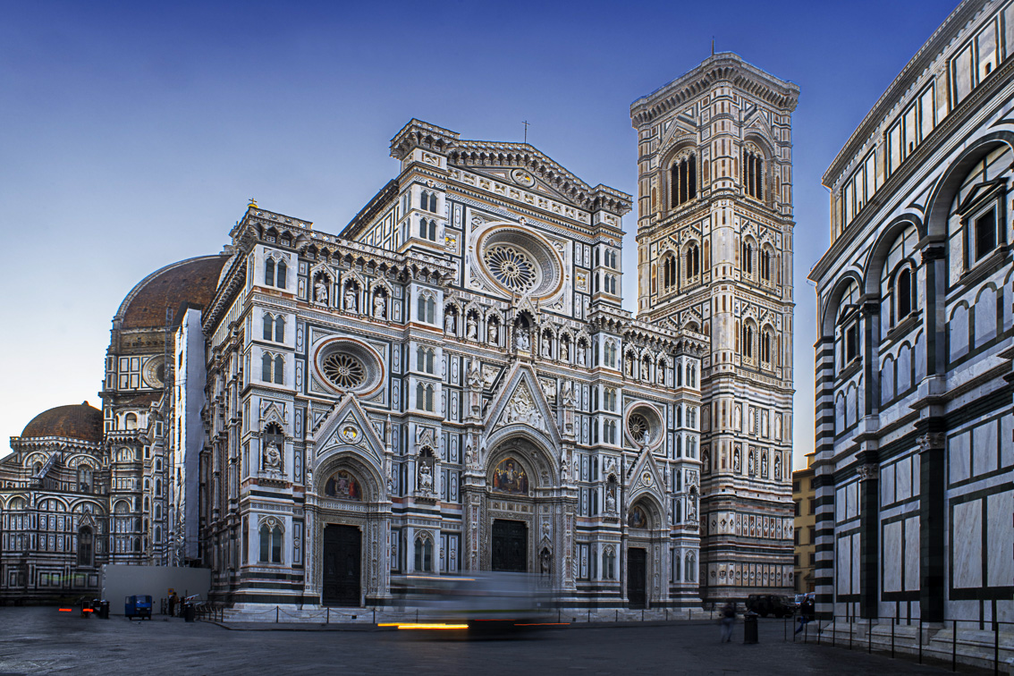 La Catedral de Florencia, conocida como Santa Maria del Fiore, esta reconocida como la obra arquitectónica que desencadenó el Renacimiento. Los cimientos del trabajo de construcción comenzaron en 1296 y tardaron más de 140 años en completarse. El estilo neogótico se puede ver en la fachada, que está decorada con paneles de mármol policromado en tonos rosa, verde y blanco. Increíblemente, su estructura icónica se construyó sin el uso de andamios.