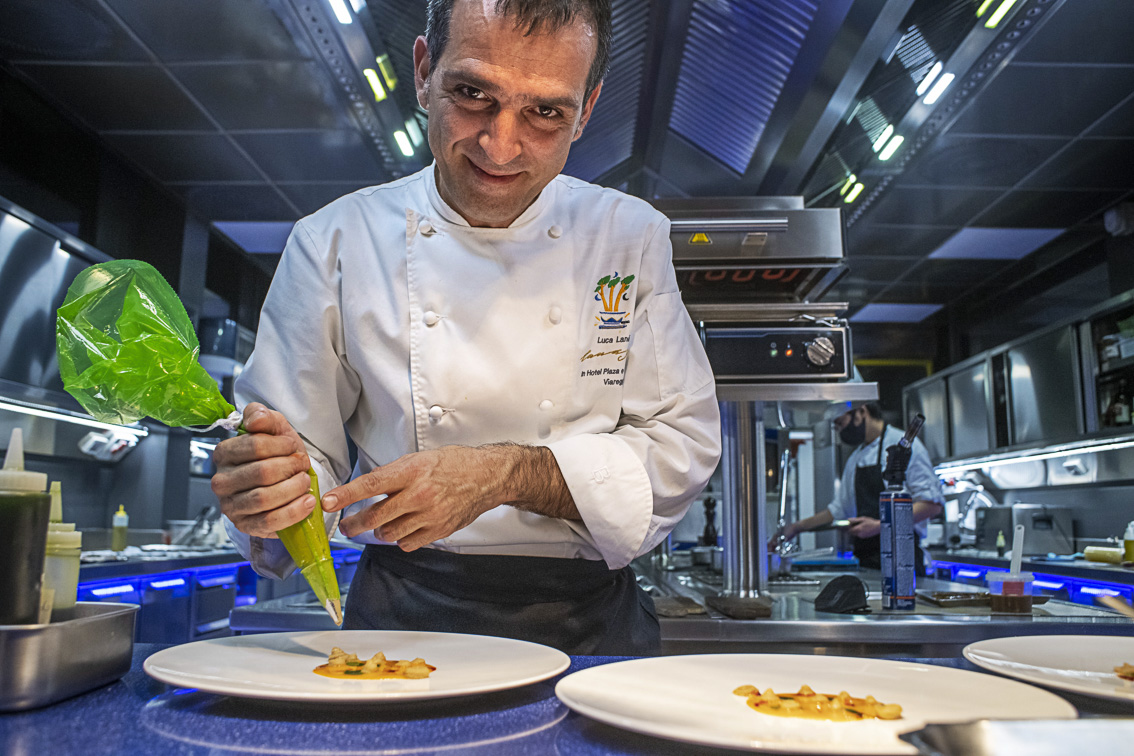 Situado en el corazón del distrito costero Art Nouveau de Viareggio, el Hotel Plaza e de Russie es un sofisticado hotel de diseño de 5 estrellas afiliado a la asociación Relais & Chateaux. Erigido en 1871 a lo largo de la ruta del Grand Tour, el Hotel se convirtió rápidamente en un lugar de encuentro de importantes personalidades que apreciaban el servicio impecable, la discreción y el estilo de este elegante palacio con vistas al mar. El hotel ahora ha sido completamente rediseñado, desde el encantador vestíbulo hasta el moderno restaurante con estrella Michelin y la lujosa elegancia de las 44 habitaciones y suites del hotel, en una combinación magistral de diseño contemporáneo y encanto cosmopolita. Su chef Luca Landi, originario de Garfagnana (Lucca), ha sido un apasionado de la cocina y de encontrar una delicada armonía en los sabores desde que era un niño. Recién salido de la escuela, comenzó su carrera bajo la dirección de Angelo Paracucchi antes de entrar en contacto con la alta cocina de Jean Micheal Brawart MOF, chef de la Closerie des Lilas de París. En la Enoteca Pinchiorri de Florencia, trabajó junto a Italo Bassi y Riccardo Monco y, en 2003, comenzó a crear nuevos sabores de helado, como su helado salado con el que ganó la Copa del Mundo de Gelato. Abrió el Ristorante Lunasia en 2004 y obtuvo su primera estrella Michelin en 2011.