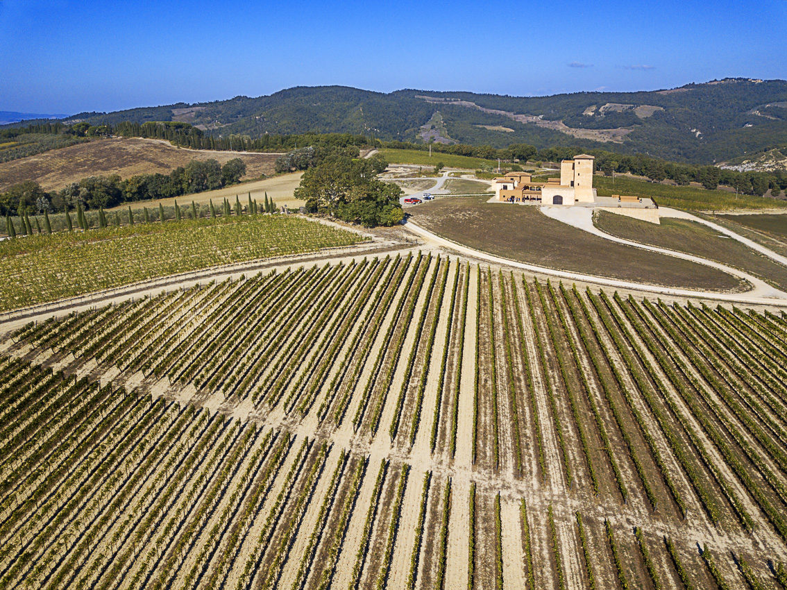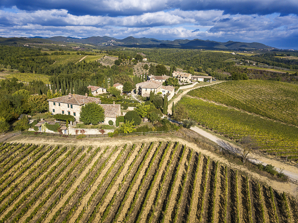 Filas ordenadas de vides sangiovese, olivares, franjas desordenadas de bosques, el rodal ocasional de pinos piñoneros y las lanzas de color verde oscuro de los cipreses marcan un paisaje idílico. Al oeste, coronando una amplia colina, se encuentra el punto culminante arquitectónico, una imponente villa renacentista, que se dice que fue diseñada por Miguel Ángel. Al este se encuentra una de esas vistas clásicas de colinas neblinosas azules que podrían haber salido de un cuadro pintado por Leonardo o Rafael. Es ni más ni menos que el corazón de la Toscana.