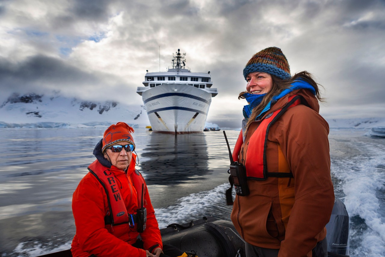 Cada vez son más los cruceros con turistas que durante el verano austral se atreven a llegar hasta el sexto continente. One Ocean Expidition no es uno más de ellos. Los viajeros de este barco acompañan a científicos que aprovechan los diferentes viajes árticos para llevar a cabo sus proyectos innovadores. Ellos encuentran de esta forma subvención y un medio de transporte, y los viajeros se aprovechan para ser espectadores de primera mano de sus estudios, ya sea con presentaciones a bordo o compartiendo sus hallazgos en primera persona. Friedlander es uno de los científicos a bordo. Está estudiando como afecta el cambio climático y la pesca del krill a los flujos migratorios de las ballenas jorobadas. También nos acompaña un equipo del Laboratorio de Robótica Marina de la Universidad de Duke, que utiliza drones con tecnología puntera para poder obtener una visión increíble y novedosa de la vida de estas misteriosas criaturas. Cada ballena tiene una cola única, explica DK Bierlich, es como su huella dactilar. A partir de las imágenes, se les puede medir, y comprobar si la pauta de crecimiento es adecuada. Para los viajeros de a bordo es como estar viendo un documental televisivo en directo.
