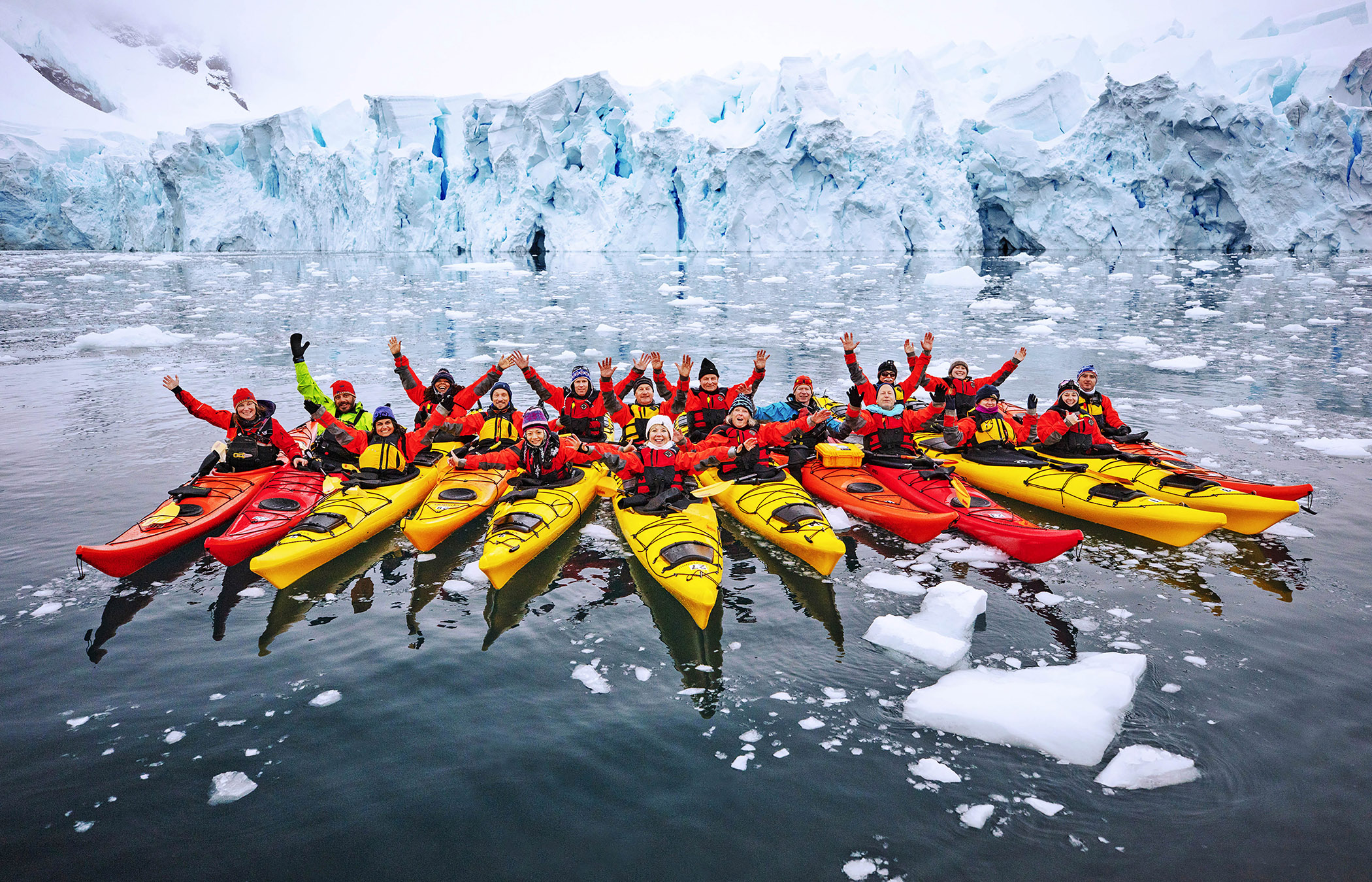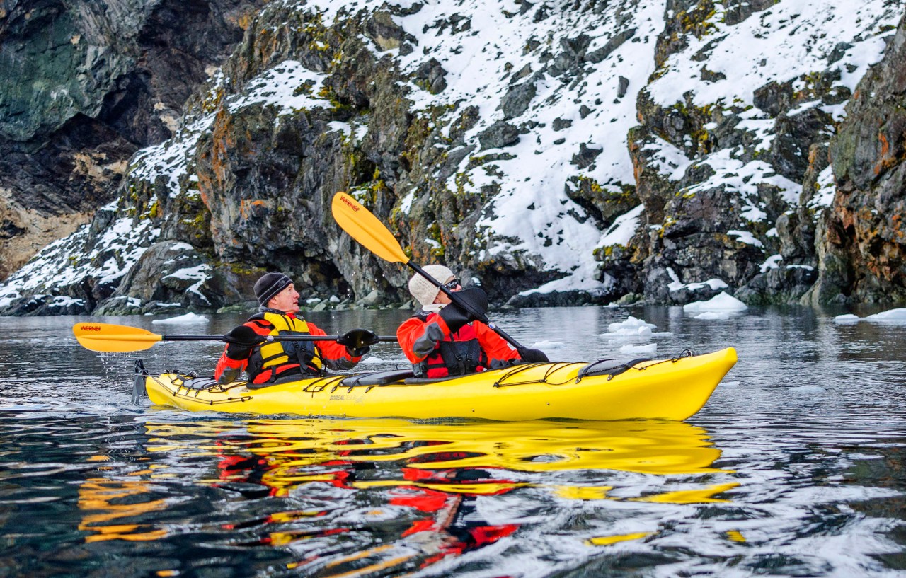 Una cincuentena de orcas nos acompañan en la travesía. La primera parada es Portal Point. Está nevando muchísimo pero eso no impide a los allí presentes en hacer un pequeño trekking y fotografiar a los pingüinos y leones marinos que se congregan. Aquí hubo una cabaña de la Investigación Antártica Británica en 1956, y ahora se ubica el Falkland Island Museum de Stanley. Al día siguiente recalamos en la Estación de Investigación Vernadsky perteneciente a Ucrania, y que les fue vendida por el gobierno británico por una libra. Los dos gobiernos salieron ganando, el ucraniano por contar con una base antártica que no tenía y el inglés por no tener que derrumbar las edificaciones y repatriar los escombros. En este lugar se descubrió en 1985 el agujero de la capa de ozono, que por cierto, se ha recuperado significativamente. Por la tarde se visita Paradise Harbour y los restos de la base argentina de Brown Station. Numerosos icebergs navegan a nuestro lado y las montañas se reflejan en el agua. Es una zona perfecta para navegar en kayak. Amanecer en Wilhelmina Bay es increíble sobretodo cuando los primeros rayos de luz tiñen de amarillo las cimas de las montañas próximas. La bahía está rodeada a ambos lados por la columna vertebral del continente, que se eleva a 2000 metros y está completamente cubierta de hielo y nieve con las islas Nansen y Brooklyn formando los otros límites. Hasta aquí llegan cientos de ballenas en busca de krill. No es difícil interactuar con ellas, de hecho saltan a escasos metros de las zodiacs. La emoción es indescriptible. Al estrecho Le Maire se le conoce como el desfiladero Kodak por la gran cantidad de fotos que se toman de él. Son 11 kilómetros de navegación entre las montañas de la isla Booth y la península Antártica.