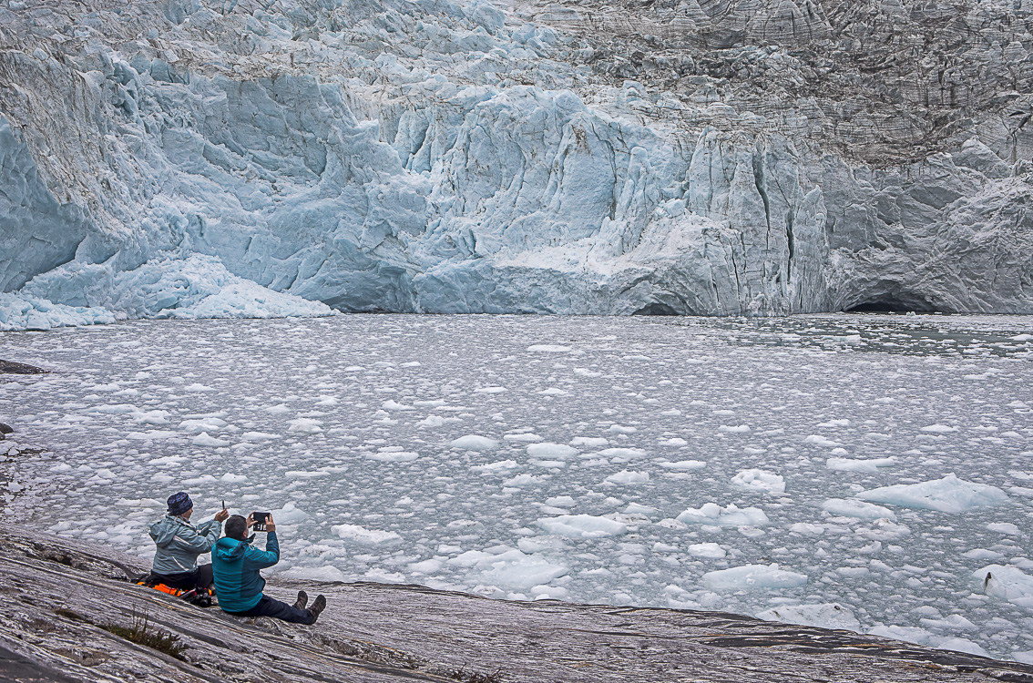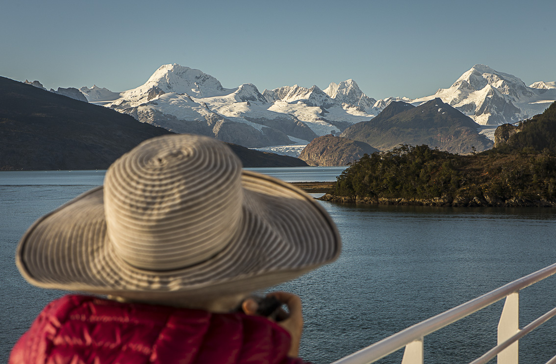 Al caer la noche navegamos alrededor del extremo occidental de Tierra del Fuego y entramos en el Canal Ballenero, nombre dado por el capitán Robert Fitz Roy, en honor a su embarcación ballenera que fue sustraída por los habitantes autóctonos y nunca fue recuperada. Con el amanecer el barco enfila las aguas heladas del Canal Beagle, tornándose la navegación cada vez más complicada a medida que transcurre la jornada. Desde la ventana de mi cabina observo un paisaje de una belleza sobrecogedora, donde un manto de nieve cubre las montañas que perfilan el Fiordo Pía. Salgo corriendo a la cubierta para ver mejor el espectáculo. El barco transita por un territorio remoto surcando unas aguas cubiertas de hielo que cada vez se torna más abundante. Sin previo aviso, de repente, el majestuoso glaciar Pía aparece ante mis ojos, es una de las sorpresas más placenteras del viaje. Su imagen es increíble, forma un muro de hielo sobre el mar con más de 100 metros de altura, hecho que no evidencia que cada año retroceda 10 metros. Aquí tiene lugar un desembarco espectacular, donde la zodiac transita frente a la monumental pared del glaciar. Al pisar tierra es todo un placer disfrutar de una serena contemplación del glacial y de los diferentes azules que emite debido a la reflexión y refracción de la luz en su masa helada. También agrada ver como se van sucediendo los desprendimientos de hielo del glaciar, desde un mirador hasta el que se llega después de una corta caminata muy angosta, donde también hay una vista impresionante del fiordo.