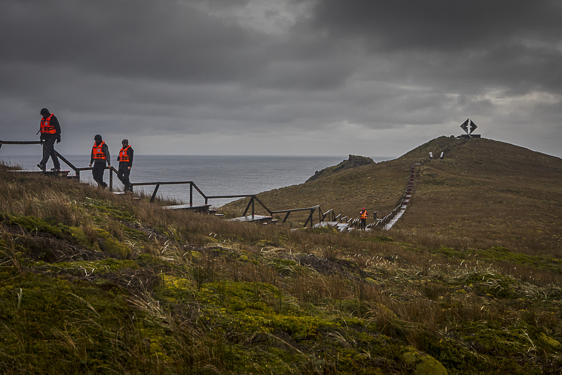 Después de surcar durante la noche el angosto Canal Murray y cruzar la Bahía Nassau, el barco se detiene y hecha el ancla. Hoy es uno de los días más esperados del viaje, ojalá pueda cumplir el sueño de pisar el Cabo de Hornos. Es un promontorio rocoso de 425 metros de altura que domina el paisaje del turbulento Paso Drake, que fue descubierto en 1616 por una expedición marítima holandesa. Aquí la climatología es extrema y la visita se suele suspender por las malas condiciones meteorológicas. Por fin, a las 5 de la mañana el capitán anuncia por megafonía que desembarcaremos: “las condiciones climatológicas son favorables, prepárense para iniciar el desembarco a la seis de la mañana”. Poner un pie en Cabo de Hornos es saborear la esencia del fin del mundo. A nuestra llegada el farero nos da la bienvenida. Las visitas son escasas y dice sonriendo “hay que tratarlas bien para que vuelvan”: La marina chilena mantiene un faro permanente en la isla, habitado por un oficial de la marina y su familia, que va rotando cada año. Además del faro, destaca la capilla Stella Maris, una pequeña construcción religiosa de madera muy entrañable. Y el monumento erigido a los marineros que perdieron la vida aquí, en uno de los mares más terroríficos de la tierra. Es una silueta de albatros recortada sobre una gran placa de acero, hace alusión a la mitología marina de la zona. La leyenda dice; «Que cuando un marinero muere cruzando el Cabo de Hornos, su alma vuela eternamente encarnada en un albatros».