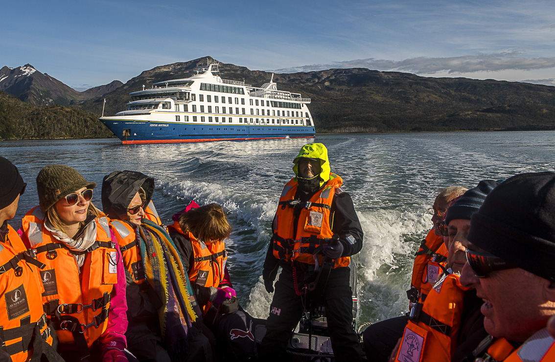 Al segundo día de mi estancia en la capital de la región de Magallanes y la Antártica chilena afloran los nervios. Son las 20,00h, y es hora de zarpar para descubrir uno de los lugares más remotos de la tierra. El capitán y toda la tripulación nos dan la bienvenida a los 206 viajeros mediante una pequeña charla de seguridad y un brindis con Champagne. Desde la ventana del bar, mientras saboreo micopa, puedo ver como las luces parpadeantes de Punta Arenas se pierden en la distancia con el ocaso de día. Estoy a bordo del Ventus un moderno buque de exploración operado por la empresa Australis que entró en funcionamiento en enero de 2018, ha sido diseñado especialmente para navegar por los canales más australes de Sudamérica. Sus características, incluyendo su tamaño, eslora y potencia de motores, le permiten tener una gran maniobrabilidad necesaria para navegar por canales y fiordos muy estrechos, por donde ningún otro crucero puede aventurarse.