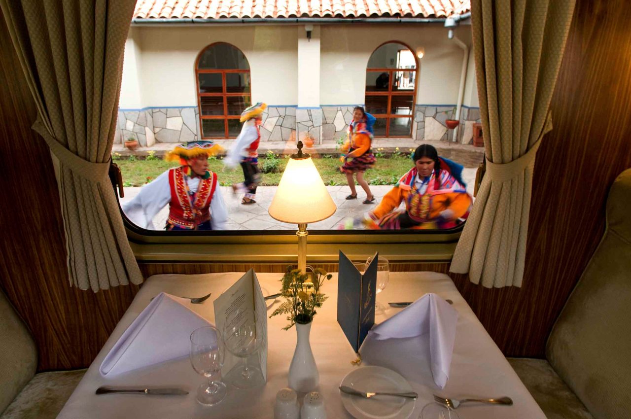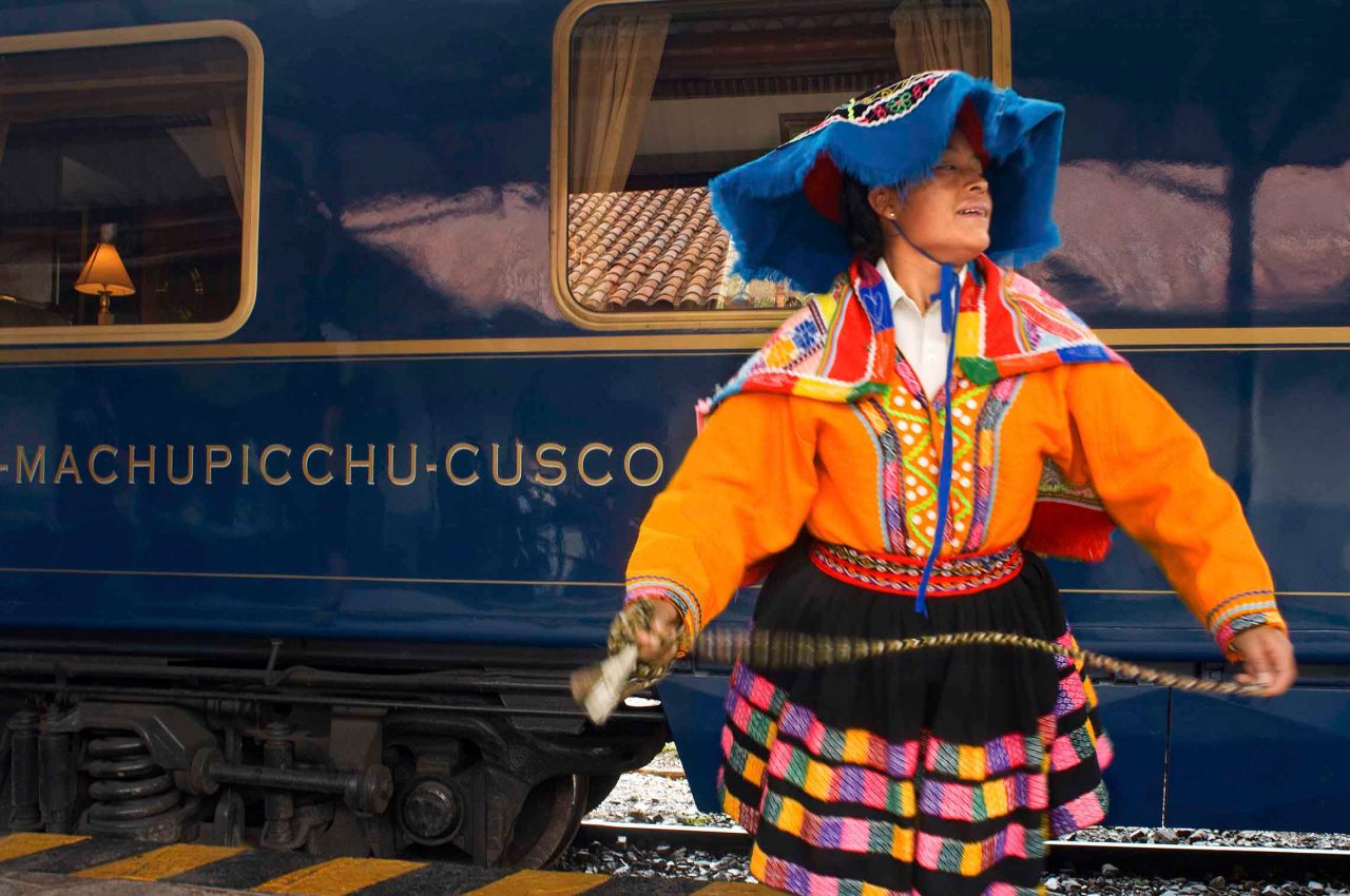El tren espera a los viajeros en la estación de Poroy, ubicada a tan solo veinte minutos por carretera del centro de Cuzco. Una docena de bailarines de danzas típicas peruanas dan la bienvenida a los pasajeros, mientras las azafatas reparten copas de champán entre los asistentes. Es el preludio de un gran viaje.