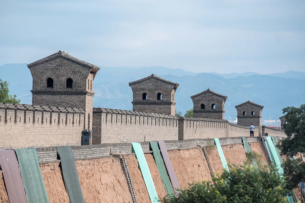 Con una longitud total de 6 kilómetros, la muralla de la ciudad antigua de Pingyao es la atracción más popular. Mide unos 12 metros de alto y de 3 a 6 metros de ancho en la parte superior, y está formado por tierra compactada cubierta por ladrillos y piedras. En pié desde el año 1370, fue la dinastía Ming quién amplió y reconstruyó la muralla que ya poseía la ciudad para proporcionar una mejor defensa. Desde entonces se ha reconstruido en varias ocasiones debido a las guerras y la erosión pero su estilo y tamaño básicos se ha mantenido sin cambios desde entonces. Toda ella es transitable a pié o en rickshaw empujado por una persona vestida con indumentaria de la época. Consta de 72 torres que simbolizan a 72 personas de gran sabiduría y las 3.000 almenas a los 3.000 discípulos de Confucio.