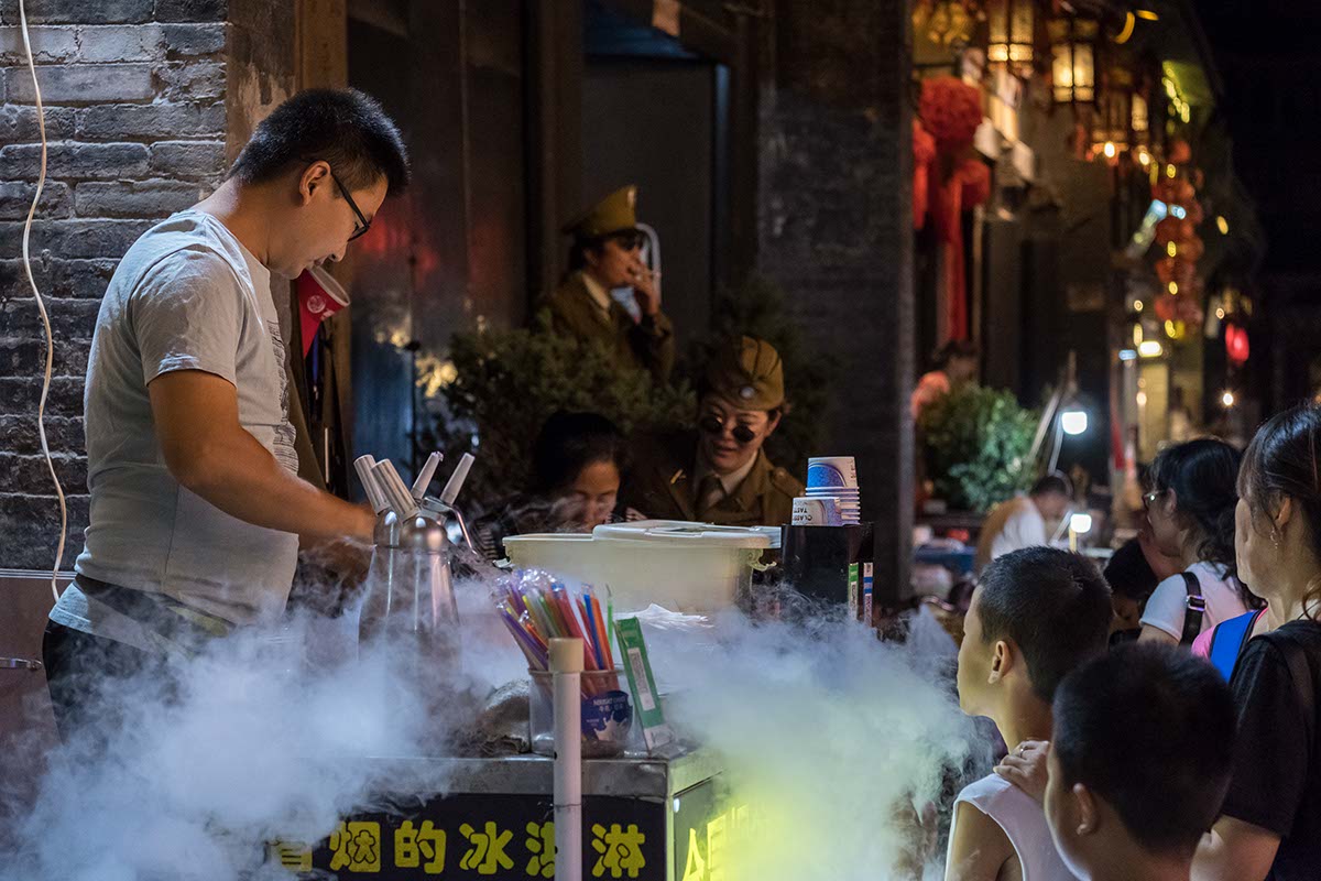 Por la noche la calle principal se convierte en un estallido de luces, colores y olores. Los farolillos rojos que durante el día ondean al viento, por la noche iluminan de un rojo intenso la ciudad. La comida local de Pingyao incluye fideos de trigo como alimento básico y la carne de res, que es su especialidad desde hace mucho tiempo, si bien rivaliza con el mercadillo nocturno de fritangas varias que toma las calles en cuanto cae el sol.