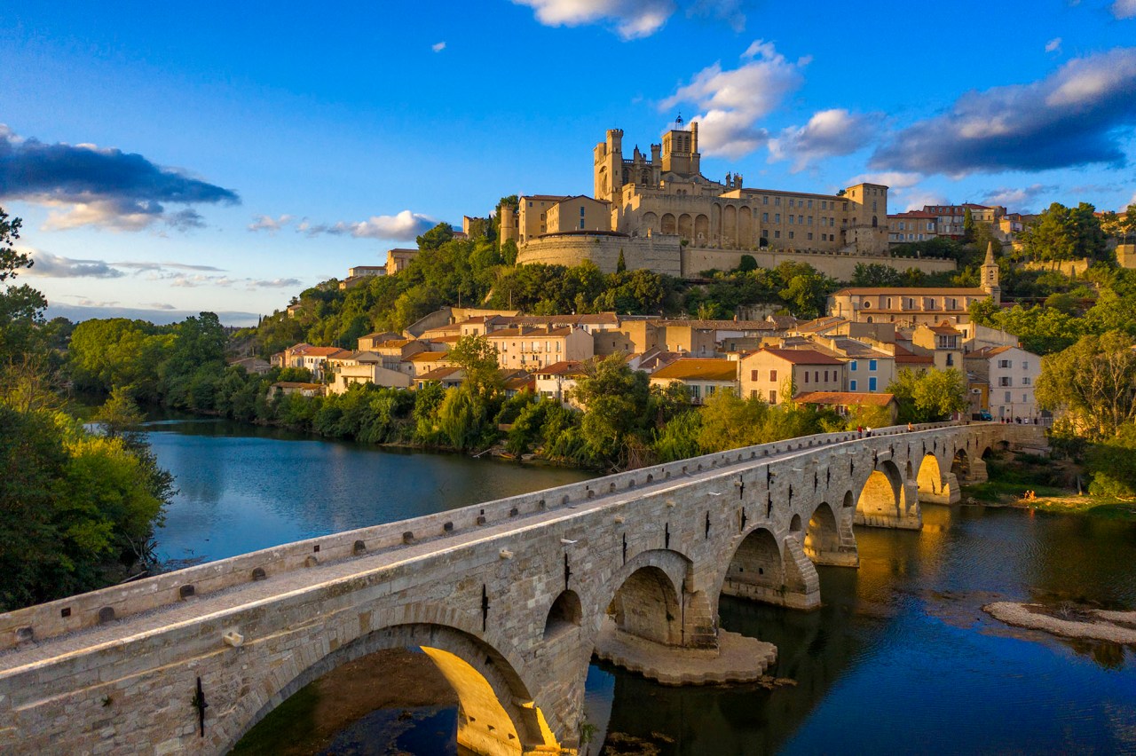 A tiro de piedra de estas esclusas se encuentra Béziers, una encantadora ciudad que se torna mágica al atardecer, especialmente desde las orillas del río Orb. Con su pintoresco paisaje fluvial y su imponente catedral, este momento del día se convierte en un espectáculo inolvidable. Desde la orilla del río Orb, junto al puente, se obtiene punto de vista privilegiado en el que admirar la silueta de la ciudad, con sus edificios históricos y sus antiguas murallas, que se destacan contra el cielo teñido de tonos cálidos y suaves. La catedral de Saint-Nazaire, una joya arquitectónica del siglo XIII, se alza majestuosa sobre la ciudad y ofrece un telón de fondo impresionante con los último rayos del atardecer. Sus altas torres y su intrincada fachada gótica se iluminan gradualmente a medida que el sol se pone, creando una imagen verdaderamente evocadora.
