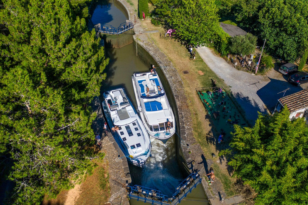 Tour with a rental boat from the Le Boat company from Homps to the nine Fonseranes locks in Béziers and back to Carcassonne.