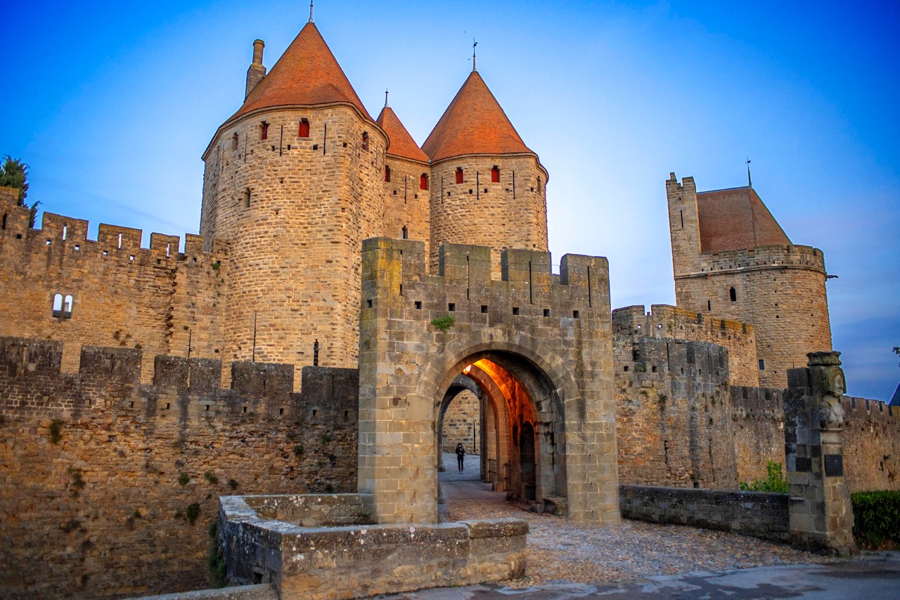 La puerta de Narbona es la entrada principal de la ciudadela, en la que todavía viven 50 residentes. Se encuentra custodiada por un puente levadizo, un foso y dos enormes torres gemelas de 30 metros de altura y su función es la de proteger el acceso oriental de la ciudad. Junto a ella se encuentra la escultura de piedra arenisca de Lady Carcas, una heroína imaginaria de una leyenda local de la que presumiblemente proviene el nombre de Carcasonne. En la parte oeste de la fortaleza se ubica la emblemática Puerta de Aude, que ofrece una vista impresionante del río y de la moderna Carcasonne. Está particularmente bien conservada y ha mantenido su aspecto típicamente medieval.