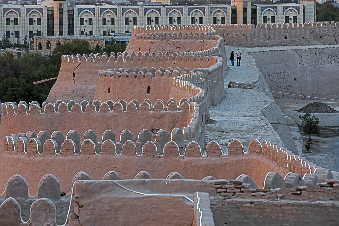 En la llanura uzbeka, al norte del desierto de Kyzylkum, Jiva acogía a las carabanas que surcaban Asia de punta a punta, acarreando mercancias valiosas. Tras la desaparición del imperio Timurida, fue con la fundación de un kanato cuando la ciudad prosperó exponemcialmente durante casi tres siglos que fueron dorados, donde el comercio de esclavos adquirió una importancia capital. En la puerta este de la ondulante muralla que protege la ciudad, aún se conservan los nichos donde las personas eran expuestas para su venta. Hoy son almacenes de tenderetes que venden souvenirs para turistas. Intramuros, la Ichan-Qala o ciudad vieja está dominada por el Kuhna Ark. Una fortificación palaciega donde residía el Kan. Destaca la sala del trono, donde el soberano recibía visitas y dispensaba justicia bajo un precioso iwan, un pórtico cubierto de azulejos con motivos ornamentales exquisitos. La azotea del palacio, como no podía ser de otra manera, brinda las mejores vistas de Ichan-Qala.