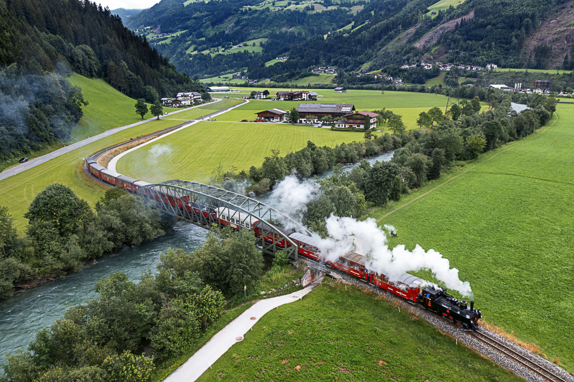 El tren, jadeante, va pasando por granjas solitarias, alimentado por los brazos inquietos del fogonero, cruzando campos de cultivo y verdes planicies, mientras arroja vapor blanco por encima de su enorme chimenea. Después de Kaltenbach-Stumm, las montañas parecen acercarse cada vez más hacia la vía férrea, y el valle se estrecha hasta formar un único punto en el horizonte. Cuando parece que uno esta llegando al final, la locomotora gira ligeramente hacia el oeste y el tren comienza a subir ligeramente mientras llegamos al último tercio del viaje camino a Mayrhofen, en una de las estampas más bellas del recorrido. El punto más álgido del recorrido se encuentra justo antes de llegar a la estación de Zell am Ziller, cuando el tren cruza el rio Ziller a través de un largo puente metálico de color verde. Ninguno de los que se encuentran en el vagón descubierto se pierde detalle, es uno de los momentos clave para tomar las mejores instantáneas.