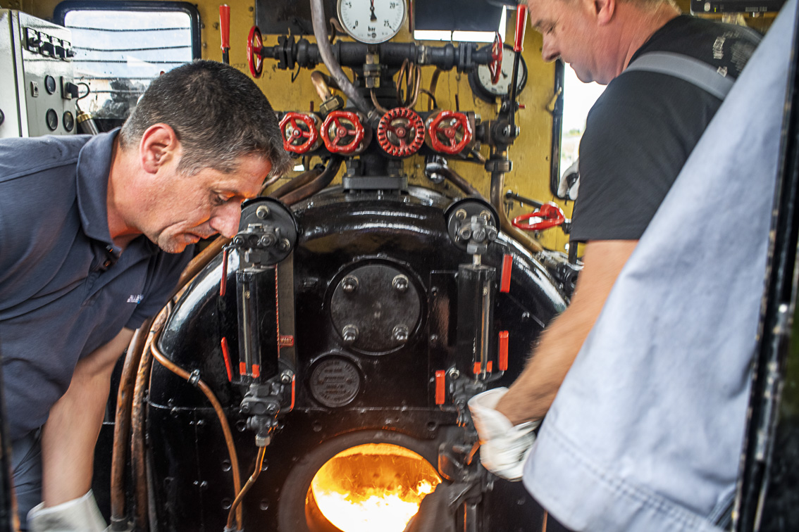Un fuerte pitido anuncia que nos ponemos en marcha. Las bielas comienzan a moverse y el traqueteo es cada vez más evidente. Nos movemos lentamente, ya que la velocidad máxima es de únicamente 40 km/h. Cuando uno se sitúa en la cabina del conductor puede palpar las altas temperaturas, de casi 60 °C, que manan de la caldera, la cual alcanza temperaturas de hasta 400 °C. Es una calor que se hace casi insoportable cuando el fogonero se coloca los guantes abre la trampilla del horno y lo alimenta con cuatro o cinco paladas de carbón.