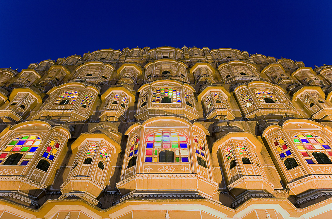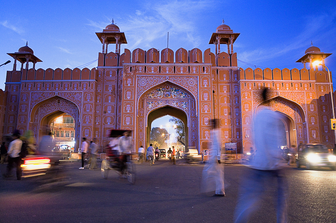 Jaipur, conocida como la ciudad rosa y capital del Rajastán. Fue erigida en 1670 por el maharajá Jai Singh II, que abandonó la antigua capital de Amber y mandó construir una ciudad nueva inspirándose en un viejo tratado de arquitectura, el Shilpa-Shastra. Encargó los planos de la nueva ciudad a un sacerdote bengalí que conocía todos los secretos de la arquitectura sagrada. Nació una ciudad amplia de anchas avenidas y ordenados bazares, algo inusual en la India que genero admiración; y eso que aún no era la ciudad rosa. Fue pintada por el color que le da nombre en 1876, con motivo de una visita del príncipe de Gales.Actualmente el rosa sigue inundando todas las fachadas del entramado urbano de la ciudad, que alberga maravillosos havelis y está salpicado de templos hindúes y jainistas. Sin embargo, durante la última década la ciudad ha cambiado a gran velocidad debido al gran incremento del tráfico que ha trasformado el ambiente y la manera de vivir los espacios públicos. Cuesta ver animales de carga por sus calles y la contaminación alcanza cotas elevadas. Ya no es aquella ciudad de carácter rural que latía al ritmo de otros tiempos. Jaipur es una ciudad de dos millones de habitantes en torno a la que se articula un estado de 54 millones de personas. Hay mucho que ver: como el Jantar Mantar(observatorio astronómico) donde los astrólogos aún miran al cielo para fijar la entrada del monzón o la fecha idónea para celebrar una boda; el Hawa Mahal (el Palacio de los Vientos), una fantástica estructura de cinco plantas con un sin fin de vanos tamizados por los que las damas de la casa real observaban el discurrir de la vida diaria sin poder ser vistas; el Museo City Palace, residencia de los maharajas desde el siglo XVIII; y el fuerte de Amber, al que los turistas suben a lomos de fatigados elefantes que en ocasiones sufren maltrato. Amber es una imponente fortaleza que fue levantada en 1592 por el clan Kachhawaha, y debido a su monumentalidad, es necesario reservar media jornada para poder hacer la visita con sosiego.