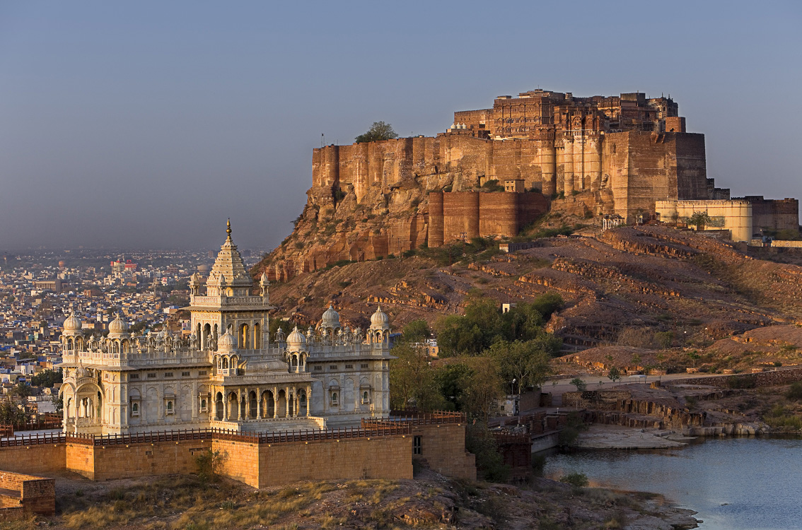 Jodhpur se extiende a las puertas del desierto teñida de añil, por algo es conocida como la ciudad azul, y protegida por el intimidador fuerte de Mehrangarh. Desde sus almenas llega a mis oídos la algarabía del Bazar. Debajo un dédalo de calles muestra una actividad incesante. Al fondo se alza el inmenso Umaid Bhawan Palace, la última locura del maharajá Umaid Singh justo antes de la independencia de la India. El resultado es espectacular: una planta de cien por doscientos metros con 347 habitaciones, que desgraciadamente no se puede visitar; Solo son accesibles al público unas dependencias que no compensan el esfuerzo que requiere el gran desplazamiento que se debe hacer desde el centro de la ciudad. Decido dirigir mis pasos al Jaswant Thada, un cenotafio de mármol maravilloso, que está a muy poca distancia del fuerte y alberga la tumba de Jaswant Singh II; el edificio es uno de los mejores ejemplos de arquitectura rajput, que además brinda unas asombrosas vistas sobre Mehrangarh.