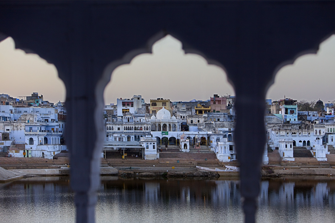 Tras cinco horas en autocar, después de serpentear por una angosta carretera, se llega a Pushkar. Según la leyenda, Brahma dejó caer una flor de loto en la tierra y surgió la ciudad que en este momento me acoge. Un lugar mágico hindú en medio del desierto al que acuden cientos de peregrinos. En esta población todo gira entorno a un gran místico lago que emana magnetismo. El lago está rodeado de ghats sagrados y templos entre los que se encuentra uno de los pocos del mundo dedicados a Brahma. Es un lugar que rezuma magia por todos sus rincones, sin embargo, hay que tener cuidado; son abundantes los sacerdotes de poca monta que intentan camelar al turista o al inocente peregrino, para sacarle unas monedas por una ofrenda carente de veracidad. Una vez al año Pushkar adquiere su mayor esplendor. Cada luna llena de noviembre, más de cincuenta mil dromedarios se dan cita en una feria que inunda la ciudad de gente, ascetas, mercachifles,malabaristas, mercaderes, tiovivos y un sin fin de personajes que aparecen al calor de la masa humana.