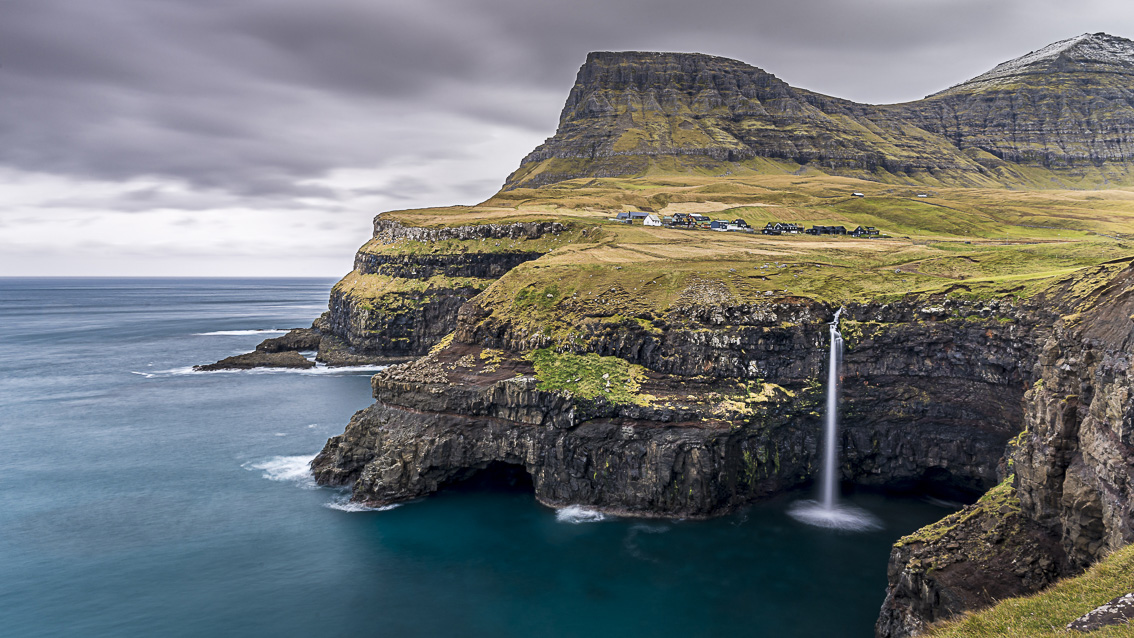 En Vagar también encontramos el pequeño pueblo de Gasadalur con su famosa y a la vez inusual cascada, Mulafossur, uno de los lugares más reconocidos y fotografiados en las Islas Feroe. El zumbido del mar al impactar en el interior de la caverna es ensordecedor y durante las tempestades, los fuertes vientos hacen retroceder el chorro de agua ofreciendo un bonito espectáculo audiovisual. Es el final abrupto para el río Dala que desagua en el mar.