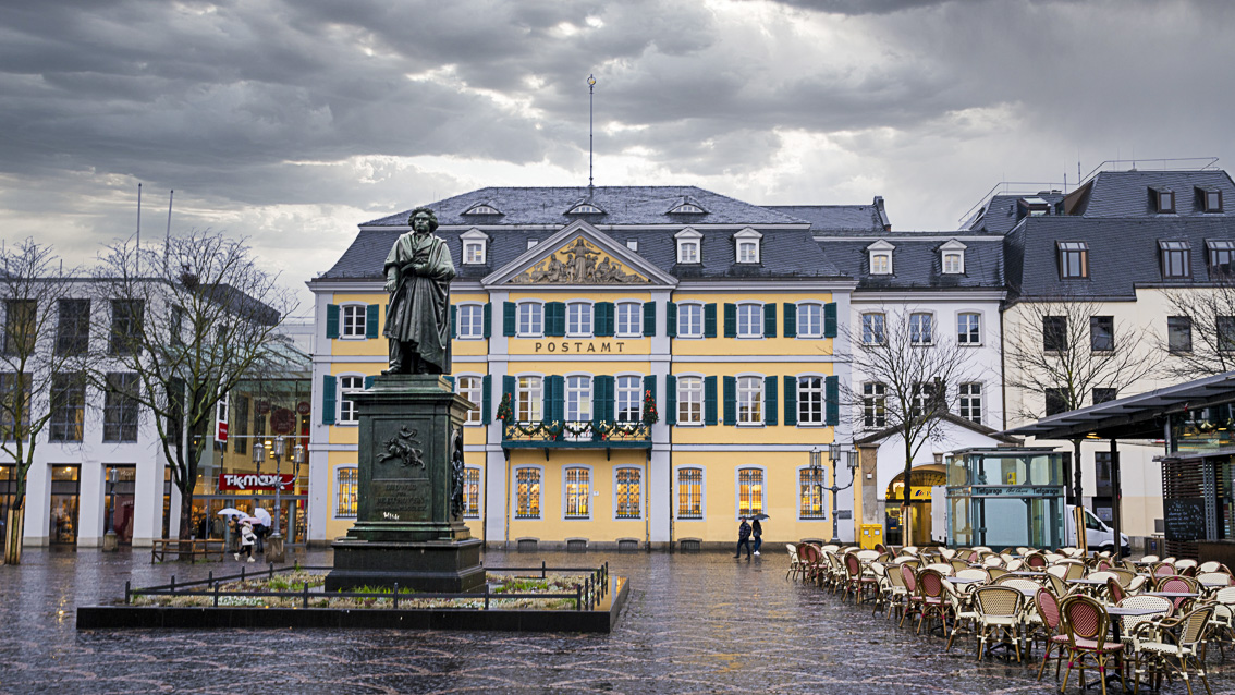 La plaza Münsterplatz, una de las tres plazas más grandes y conocidasde la ciudad y la que alberga el mercado navideño de la ciudad cada año. Ahí está la catedral que remonta sus orígenes al siglo XI, y también aparece el vistoso edificio de correos, cuya rítmica fachada pintada de amarillo y repleta de ventanas es el mejor telón de fondo para el gran protagonista de la plaza. Ese no es otro que el hijo más ilustre de la ciudad, Ludwig van Beethoven, cuya estatua conmemorativa se ha convertido en habitual punto de encuentro para vecinos y visitantes.