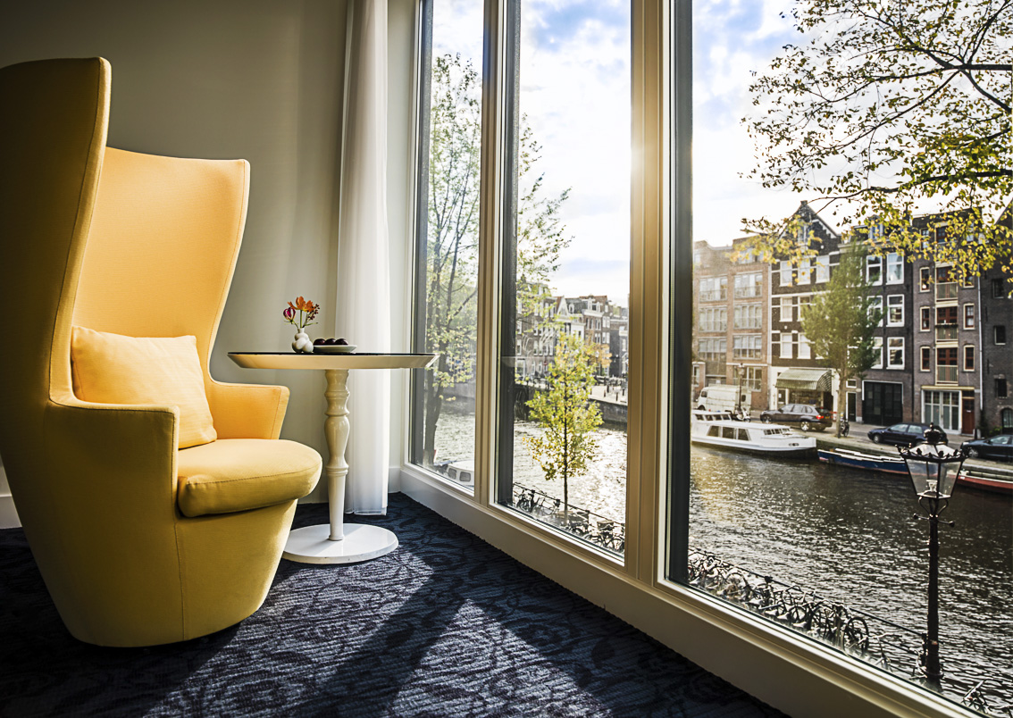 Las 122 habitaciones y cinco suites continúan este juego entre fantasía y tradición. La luz natural inunda los espacios gracias a grandes ventanales, mientras que detalles como lavabos pintados a mano, clogs decorativos, papeles pintados con motivos de Delft o las célebres “Connected Polarity” —fotografías que combinan objetos inconexos, como peces y cubiertos— sugieren el espíritu tolerante y abierto de Ámsterdam. El diseño favorece el uso del espacio con planos abiertos donde el área de descanso se funde con la de baño, y en algunas categorías las vistas al canal completan la experiencia. La Prinsengracht Suite, la más grande del hotel, ofrece además la terraza privada más amplia de la ciudad.